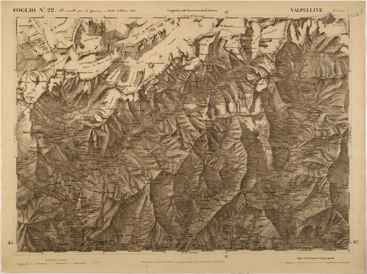 "FOGLIO 22 VALPELLINE - La proiezione adottata è quella di Flamsteed modificata o di Bonne. Il centro del circolo meridiano stabilito nell' Osservatorio Reale di Torino fu scelto per origine delle coordinate o centro di sviluppamento. Latitudine e longitudine est di questo punto dal meridiano di Parigi,determinate astronomicamente, risultarono: 45°04'08",06 e 5°21'24",75. Elementi che servirono ai calcoli della proiezione furono:semiasse maggiore e minore della terra lunghezza della normale nel punto d'origine raggio del circolo osculatore al meridiano nel punto d'origine schiacciamento terrestre quadrato dell'eccentricità. La superficie fu divisa in quattro regioni corrispontenti al nord-est, sud-est, sud-ovest, nord-ovest comprendendo in complesso 90 fogli. "