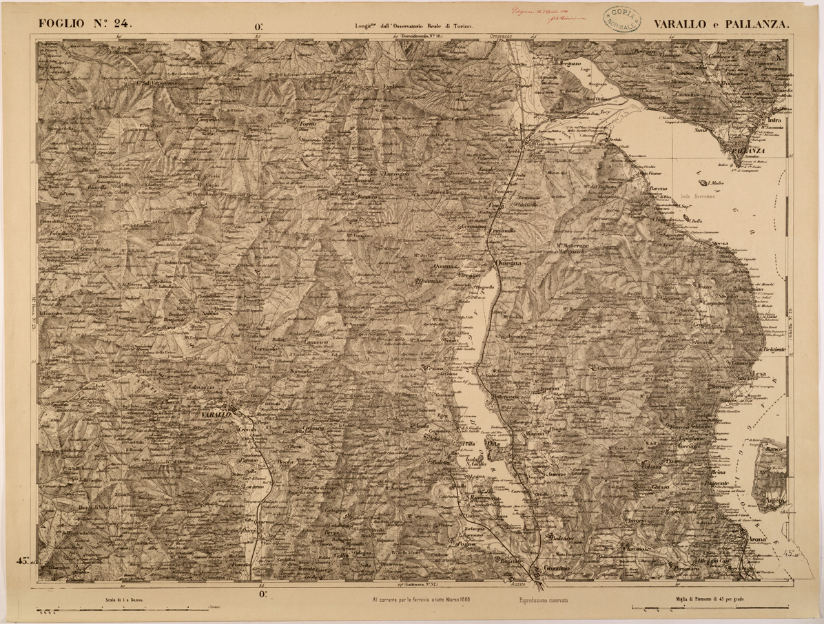 "FOGLIO 24 VARALLO E PALLANZA - La proiezione adottata è quella di Flamsteed modificata o di Bonne. Il centro del circolo meridiano stabilito nell' Osservatorio Reale di Torino fu scelto per origine delle coordinate o centro di sviluppamento. Latitudine e longitudine est di questo punto dal meridiano di Parigi,determinate astronomicamente, risultarono: 45°04'08",06 e 5°21'24",75. Elementi che servirono ai calcoli della proiezione furono:semiasse maggiore e minore della terra lunghezza della normale nel punto d'origine raggio del circolo osculatore al meridiano nel punto d'origine schiacciamento terrestre quadrato dell'eccentricità. La superficie fu divisa in quattro regioni corrispontenti al nord-est, sud-est, sud-ovest, nord-ovest comprendendo in complesso 90 fogli. "