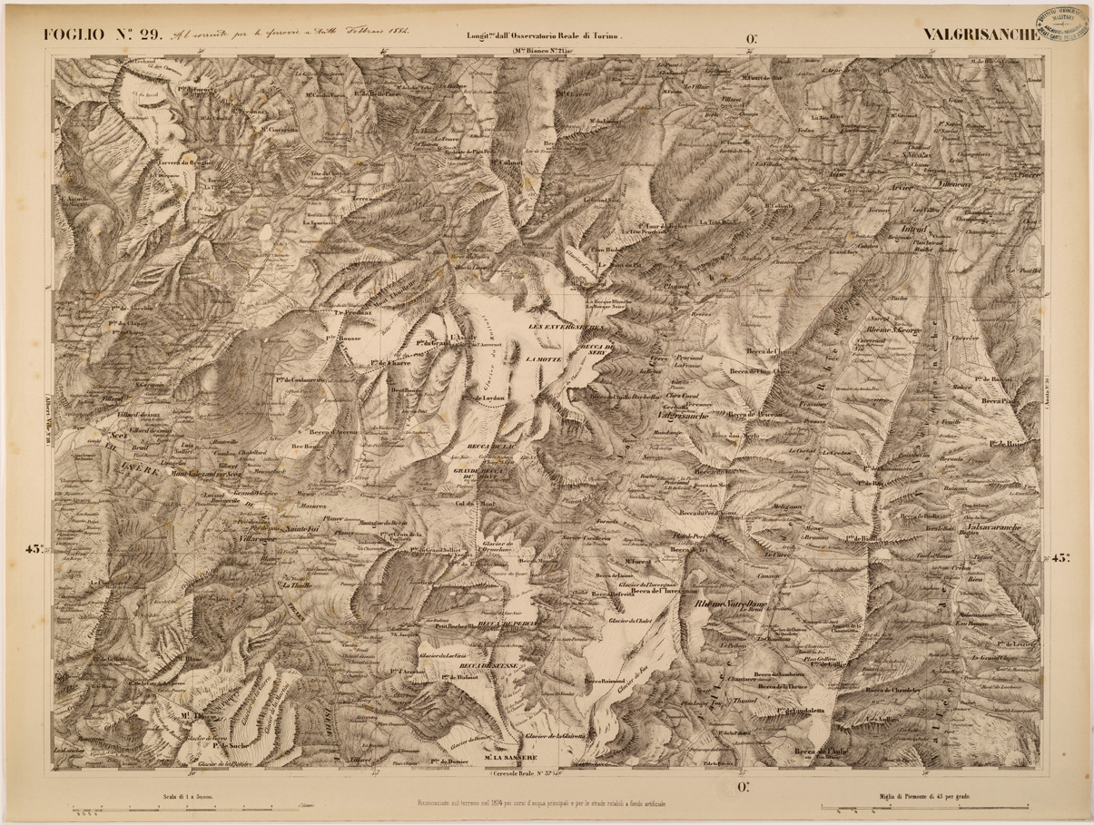 "FOGLIO 29 VALGRISANCHE - La proiezione adottata è quella di Flamsteed modificata o di Bonne. Il centro del circolo meridiano stabilito nell' Osservatorio Reale di Torino fu scelto per origine delle coordinate o centro di sviluppamento. Latitudine e longitudine est di questo punto dal meridiano di Parigi,determinate astronomicamente, risultarono: 45°04'08",06 e 5°21'24",75. Elementi che servirono ai calcoli della proiezione furono:semiasse maggiore e minore della terra lunghezza della normale nel punto d'origine raggio del circolo osculatore al meridiano nel punto d'origine schiacciamento terrestre quadrato dell'eccentricità. La superficie fu divisa in quattro regioni corrispontenti al nord-est, sud-est, sud-ovest, nord-ovest comprendendo in complesso 90 fogli. "