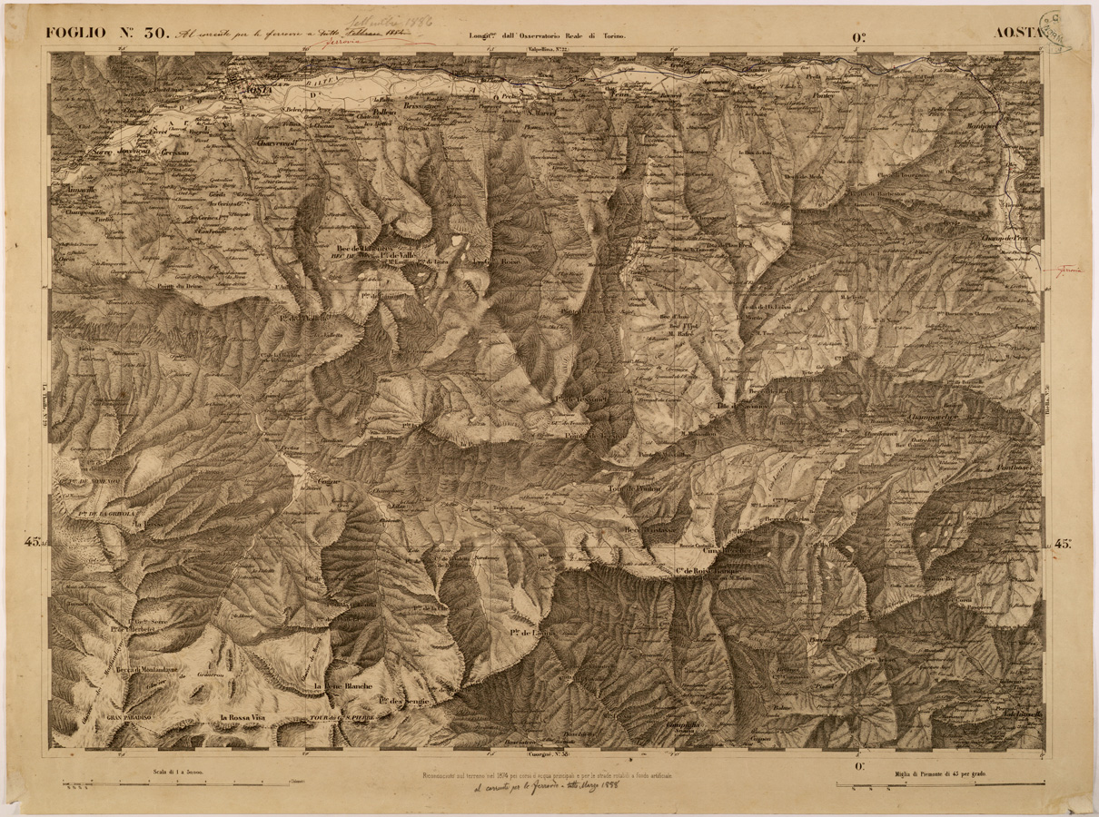 "FOGLIO 30 AOSTA - La proiezione adottata è quella di Flamsteed modificata o di Bonne. Il centro del circolo meridiano stabilito nell' Osservatorio Reale di Torino fu scelto per origine delle coordinate o centro di sviluppamento. Latitudine e longitudine est di questo punto dal meridiano di Parigi,determinate astronomicamente, risultarono: 45°04'08",06 e 5°21'24",75. Elementi che servirono ai calcoli della proiezione furono:semiasse maggiore e minore della terra lunghezza della normale nel punto d'origine raggio del circolo osculatore al meridiano nel punto d'origine schiacciamento terrestre quadrato dell'eccentricità. La superficie fu divisa in quattro regioni corrispontenti al nord-est, sud-est, sud-ovest, nord-ovest comprendendo in complesso 90 fogli. "