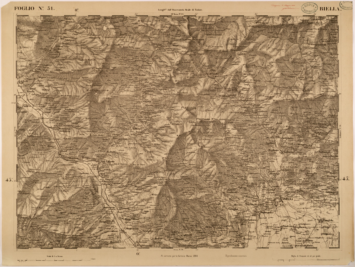 "FOGLIO 31 BIELLA - La proiezione adottata è quella di Flamsteed modificata o di Bonne. Il centro del circolo meridiano stabilito nell' Osservatorio Reale di Torino fu scelto per origine delle coordinate o centro di sviluppamento. Latitudine e longitudine est di questo punto dal meridiano di Parigi,determinate astronomicamente, risultarono: 45°04'08",06 e 5°21'24",75. Elementi che servirono ai calcoli della proiezione furono:semiasse maggiore e minore della terra lunghezza della normale nel punto d'origine raggio del circolo osculatore al meridiano nel punto d'origine schiacciamento terrestre quadrato dell'eccentricità. La superficie fu divisa in quattro regioni corrispontenti al nord-est, sud-est, sud-ovest, nord-ovest comprendendo in complesso 90 fogli. "