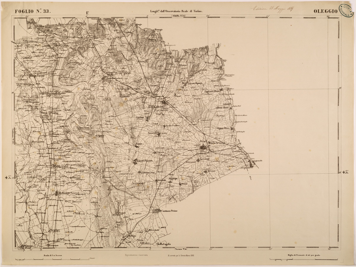 "FOGLIO 33 OLEGGIO - La proiezione adottata è quella di Flamsteed modificata o di Bonne. Il centro del circolo meridiano stabilito nell' Osservatorio Reale di Torino fu scelto per origine delle coordinate o centro di sviluppamento. Latitudine e longitudine est di questo punto dal meridiano di Parigi,determinate astronomicamente, risultarono: 45°04'08",06 e 5°21'24",75. Elementi che servirono ai calcoli della proiezione furono:semiasse maggiore e minore della terra lunghezza della normale nel punto d'origine raggio del circolo osculatore al meridiano nel punto d'origine schiacciamento terrestre quadrato dell'eccentricità. La superficie fu divisa in quattro regioni corrispontenti al nord-est, sud-est, sud-ovest, nord-ovest comprendendo in complesso 90 fogli. "