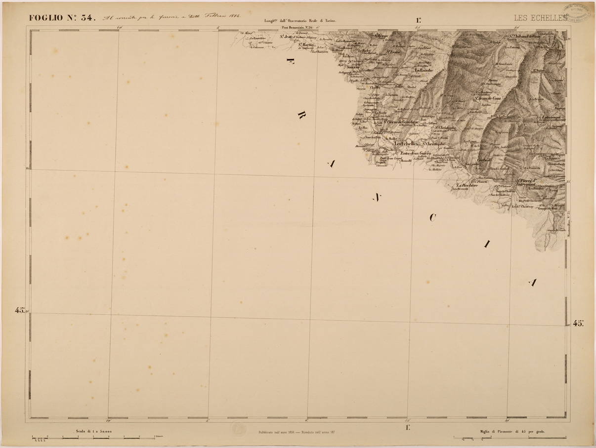 "FOGLIO 34 LES ECHELLES - La proiezione adottata è quella di Flamsteed modificata o di Bonne. Il centro del circolo meridiano stabilito nell' Osservatorio Reale di Torino fu scelto per origine delle coordinate o centro di sviluppamento. Latitudine e longitudine est di questo punto dal meridiano di Parigi,determinate astronomicamente, risultarono: 45°04'08",06 e 5°21'24",75. Elementi che servirono ai calcoli della proiezione furono:semiasse maggiore e minore della terra lunghezza della normale nel punto d'origine raggio del circolo osculatore al meridiano nel punto d'origine schiacciamento terrestre quadrato dell'eccentricità. La superficie fu divisa in quattro regioni corrispontenti al nord-est, sud-est, sud-ovest, nord-ovest comprendendo in complesso 90 fogli. "