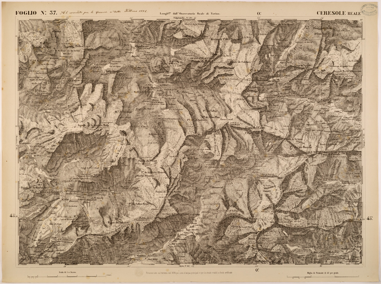 "FOGLIO 37 CERESOLE REALE - La proiezione adottata è quella di Flamsteed modificata o di Bonne. Il centro del circolo meridiano stabilito nell' Osservatorio Reale di Torino fu scelto per origine delle coordinate o centro di sviluppamento. Latitudine e longitudine est di questo punto dal meridiano di Parigi,determinate astronomicamente, risultarono: 45°04'08",06 e 5°21'24",75. Elementi che servirono ai calcoli della proiezione furono:semiasse maggiore e minore della terra lunghezza della normale nel punto d'origine raggio del circolo osculatore al meridiano nel punto d'origine schiacciamento terrestre quadrato dell'eccentricità. La superficie fu divisa in quattro regioni corrispontenti al nord-est, sud-est, sud-ovest, nord-ovest comprendendo in complesso 90 fogli. "