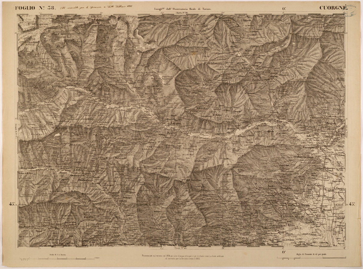 "FOGLIO 38 CUORGNE' - La proiezione adottata è quella di Flamsteed modificata o di Bonne. Il centro del circolo meridiano stabilito nell' Osservatorio Reale di Torino fu scelto per origine delle coordinate o centro di sviluppamento. Latitudine e longitudine est di questo punto dal meridiano di Parigi,determinate astronomicamente, risultarono: 45°04'08",06 e 5°21'24",75. Elementi che servirono ai calcoli della proiezione furono:semiasse maggiore e minore della terra lunghezza della normale nel punto d'origine raggio del circolo osculatore al meridiano nel punto d'origine schiacciamento terrestre quadrato dell'eccentricità. La superficie fu divisa in quattro regioni corrispontenti al nord-est, sud-est, sud-ovest, nord-ovest comprendendo in complesso 90 fogli. "