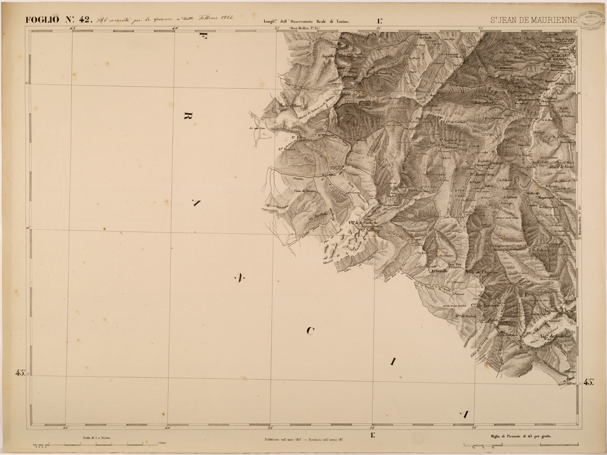 "FOGLIO 42 ST JEAN DE MAURIENNE - La proiezione adottata è quella di Flamsteed modificata o di Bonne. Il centro del circolo meridiano stabilito nell' Osservatorio Reale di Torino fu scelto per origine delle coordinate o centro di sviluppamento. Latitudine e longitudine est di questo punto dal meridiano di Parigi,determinate astronomicamente, risultarono: 45°04'08",06 e 5°21'24",75. Elementi che servirono ai calcoli della proiezione furono:semiasse maggiore e minore della terra lunghezza della normale nel punto d'origine raggio del circolo osculatore al meridiano nel punto d'origine schiacciamento terrestre quadrato dell'eccentricità. La superficie fu divisa in quattro regioni corrispontenti al nord-est, sud-est, sud-ovest, nord-ovest comprendendo in complesso 90 fogli. "