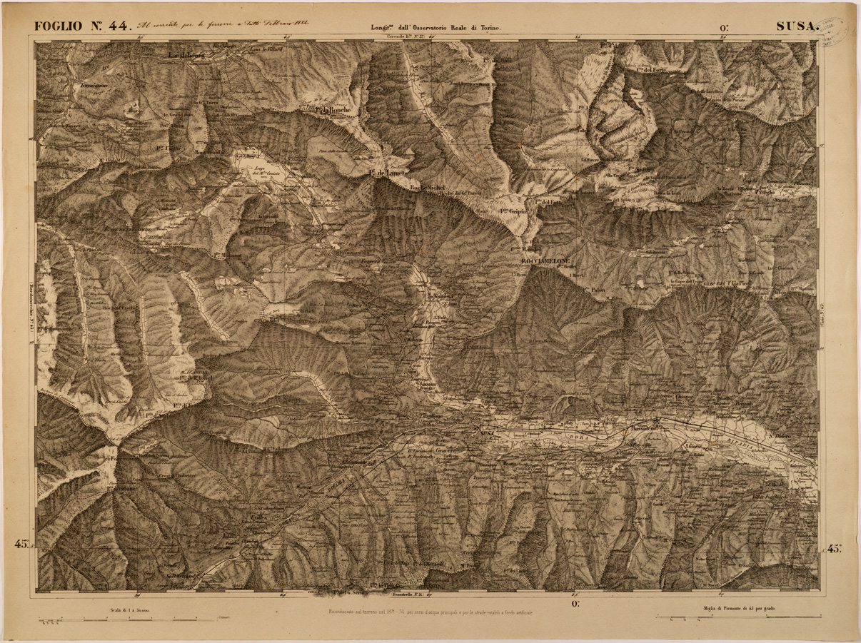 "FOGLIO 44 SUSA - La proiezione adottata è quella di Flamsteed modificata o di Bonne. Il centro del circolo meridiano stabilito nell' Osservatorio Reale di Torino fu scelto per origine delle coordinate o centro di sviluppamento. Latitudine e longitudine est di questo punto dal meridiano di Parigi,determinate astronomicamente, risultarono: 45°04'08",06 e 5°21'24",75. Elementi che servirono ai calcoli della proiezione furono:semiasse maggiore e minore della terra lunghezza della normale nel punto d'origine raggio del circolo osculatore al meridiano nel punto d'origine schiacciamento terrestre quadrato dell'eccentricità. La superficie fu divisa in quattro regioni corrispontenti al nord-est, sud-est, sud-ovest, nord-ovest comprendendo in complesso 90 fogli. "