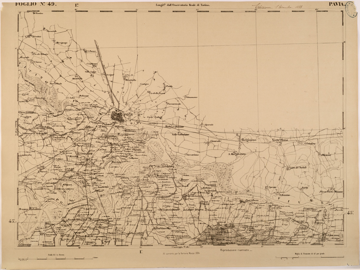 "FOGLIO 49 PAVIA - La proiezione adottata è quella di Flamsteed modificata o di Bonne. Il centro del circolo meridiano stabilito nell' Osservatorio Reale di Torino fu scelto per origine delle coordinate o centro di sviluppamento. Latitudine e longitudine est di questo punto dal meridiano di Parigi,determinate astronomicamente, risultarono: 45°04'08",06 e 5°21'24",75. Elementi che servirono ai calcoli della proiezione furono:semiasse maggiore e minore della terra lunghezza della normale nel punto d'origine raggio del circolo osculatore al meridiano nel punto d'origine schiacciamento terrestre quadrato dell'eccentricità. La superficie fu divisa in quattro regioni corrispontenti al nord-est, sud-est, sud-ovest, nord-ovest comprendendo in complesso 90 fogli. "