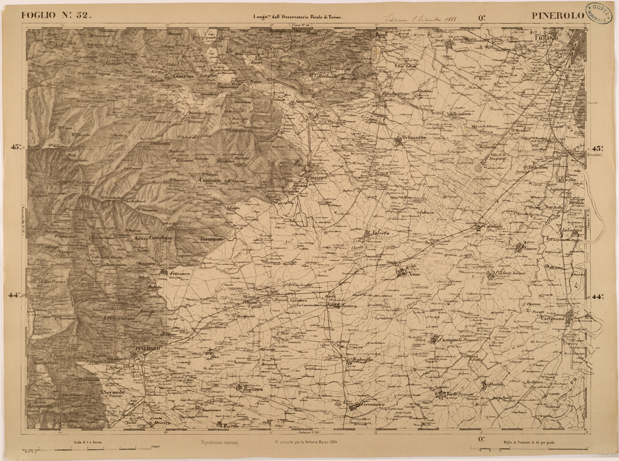 "FOGLIO 52 PINEROLO - La proiezione adottata è quella di Flamsteed modificata o di Bonne. Il centro del circolo meridiano stabilito nell' Osservatorio Reale di Torino fu scelto per origine delle coordinate o centro di sviluppamento. Latitudine e longitudine est di questo punto dal meridiano di Parigi,determinate astronomicamente, risultarono: 45°04'08",06 e 5°21'24",75. Elementi che servirono ai calcoli della proiezione furono:semiasse maggiore e minore della terra lunghezza della normale nel punto d'origine raggio del circolo osculatore al meridiano nel punto d'origine schiacciamento terrestre quadrato dell'eccentricità. La superficie fu divisa in quattro regioni corrispontenti al nord-est, sud-est, sud-ovest, nord-ovest comprendendo in complesso 90 fogli. "