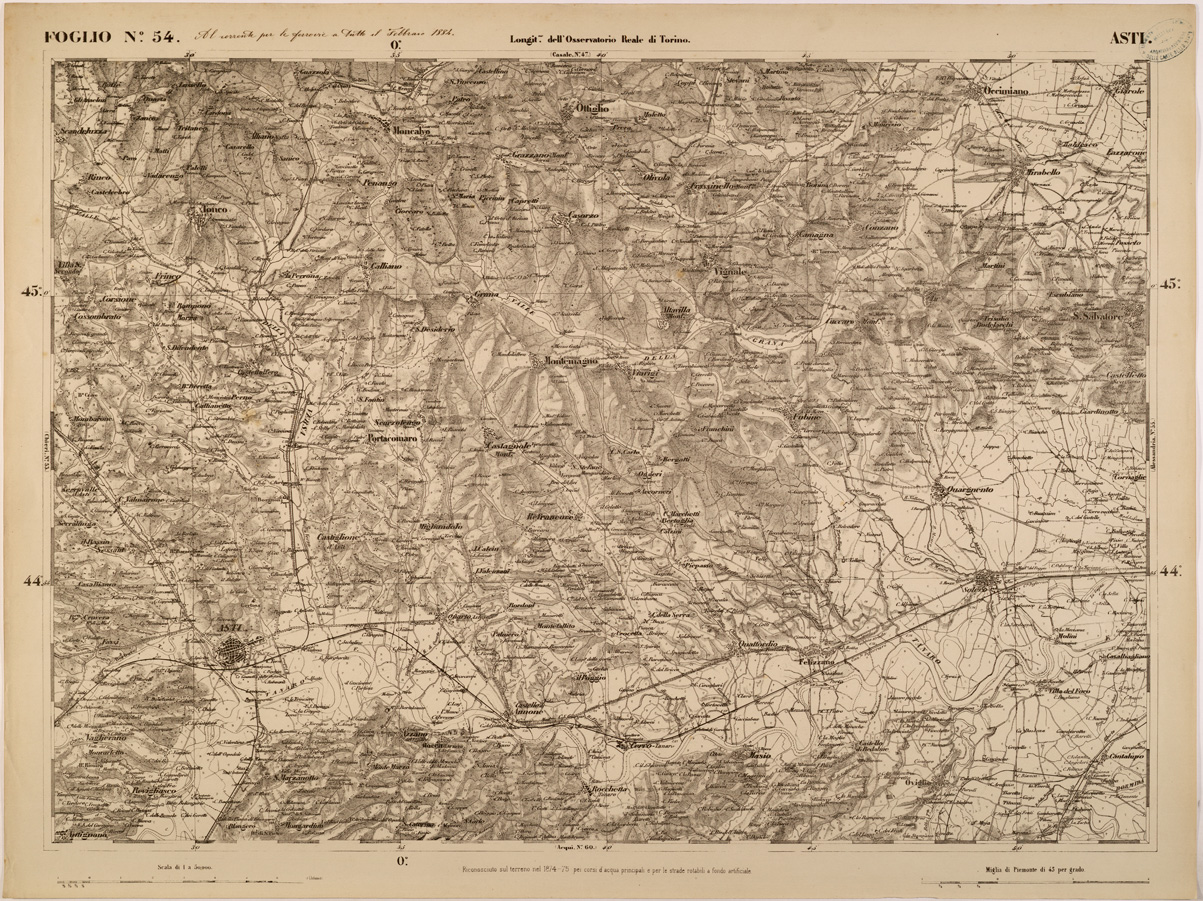 "FOGLIO 54 ASTI - La proiezione adottata è quella di Flamsteed modificata o di Bonne. Il centro del circolo meridiano stabilito nell' Osservatorio Reale di Torino fu scelto per origine delle coordinate o centro di sviluppamento. Latitudine e longitudine est di questo punto dal meridiano di Parigi,determinate astronomicamente, risultarono: 45°04'08",06 e 5°21'24",75. Elementi che servirono ai calcoli della proiezione furono:semiasse maggiore e minore della terra lunghezza della normale nel punto d'origine raggio del circolo osculatore al meridiano nel punto d'origine schiacciamento terrestre quadrato dell'eccentricità. La superficie fu divisa in quattro regioni corrispontenti al nord-est, sud-est, sud-ovest, nord-ovest comprendendo in complesso 90 fogli. "