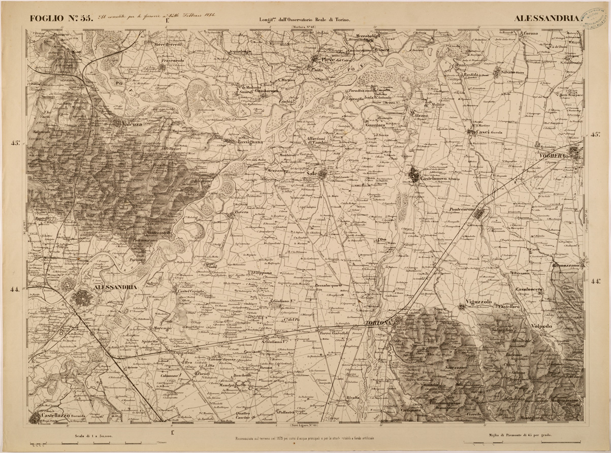 "FOGLIO 55 ALESSANDRIA - La proiezione adottata è quella di Flamsteed modificata o di Bonne. Il centro del circolo meridiano stabilito nell' Osservatorio Reale di Torino fu scelto per origine delle coordinate o centro di sviluppamento. Latitudine e longitudine est di questo punto dal meridiano di Parigi,determinate astronomicamente, risultarono: 45°04'08",06 e 5°21'24",75. Elementi che servirono ai calcoli della proiezione furono:semiasse maggiore e minore della terra lunghezza della normale nel punto d'origine raggio del circolo osculatore al meridiano nel punto d'origine schiacciamento terrestre quadrato dell'eccentricità. La superficie fu divisa in quattro regioni corrispontenti al nord-est, sud-est, sud-ovest, nord-ovest comprendendo in complesso 90 fogli. "