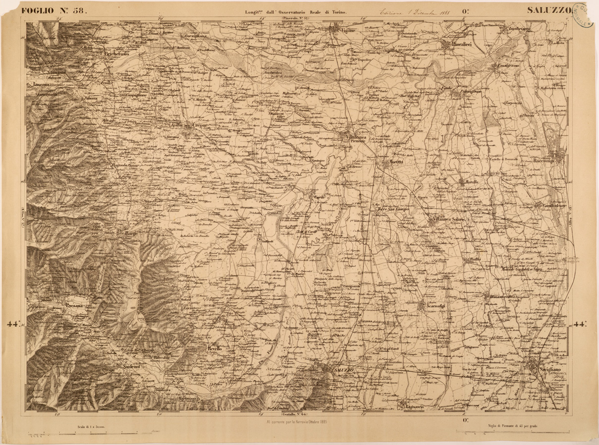 "FOGLIO 58 SALUZZO - La proiezione adottata è quella di Flamsteed modificata o di Bonne. Il centro del circolo meridiano stabilito nell' Osservatorio Reale di Torino fu scelto per origine delle coordinate o centro di sviluppamento. Latitudine e longitudine est di questo punto dal meridiano di Parigi,determinate astronomicamente, risultarono: 45°04'08",06 e 5°21'24",75. Elementi che servirono ai calcoli della proiezione furono:semiasse maggiore e minore della terra lunghezza della normale nel punto d'origine raggio del circolo osculatore al meridiano nel punto d'origine schiacciamento terrestre quadrato dell'eccentricità. La superficie fu divisa in quattro regioni corrispontenti al nord-est, sud-est, sud-ovest, nord-ovest comprendendo in complesso 90 fogli. "