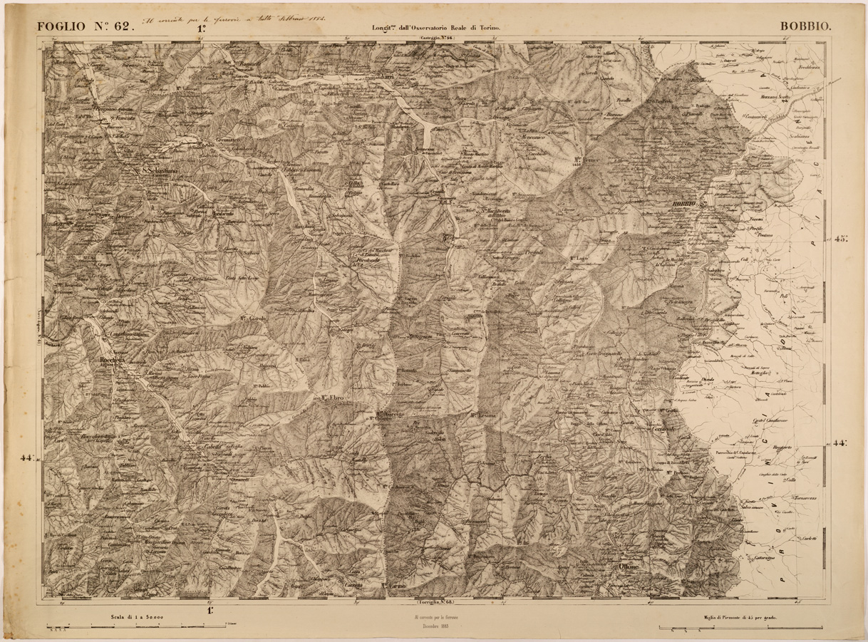 "FOGLIO 62 BOBBIO - La proiezione adottata è quella di Flamsteed modificata o di Bonne. Il centro del circolo meridiano stabilito nell' Osservatorio Reale di Torino fu scelto per origine delle coordinate o centro di sviluppamento. Latitudine e longitudine est di questo punto dal meridiano di Parigi,determinate astronomicamente, risultarono: 45°04'08",06 e 5°21'24",75. Elementi che servirono ai calcoli della proiezione furono:semiasse maggiore e minore della terra lunghezza della normale nel punto d'origine raggio del circolo osculatore al meridiano nel punto d'origine schiacciamento terrestre quadrato dell'eccentricità. La superficie fu divisa in quattro regioni corrispontenti al nord-est, sud-est, sud-ovest, nord-ovest comprendendo in complesso 90 fogli. "