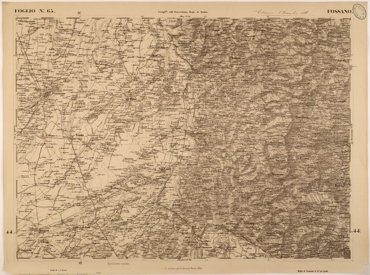 "FOGLIO 65 FOSSANO - La proiezione adottata è quella di Flamsteed modificata o di Bonne. Il centro del circolo meridiano stabilito nell' Osservatorio Reale di Torino fu scelto per origine delle coordinate o centro di sviluppamento. Latitudine e longitudine est di questo punto dal meridiano di Parigi,determinate astronomicamente, risultarono: 45°04'08",06 e 5°21'24",75. Elementi che servirono ai calcoli della proiezione furono:semiasse maggiore e minore della terra lunghezza della normale nel punto d'origine raggio del circolo osculatore al meridiano nel punto d'origine schiacciamento terrestre quadrato dell'eccentricità. La superficie fu divisa in quattro regioni corrispontenti al nord-est, sud-est, sud-ovest, nord-ovest comprendendo in complesso 90 fogli. "