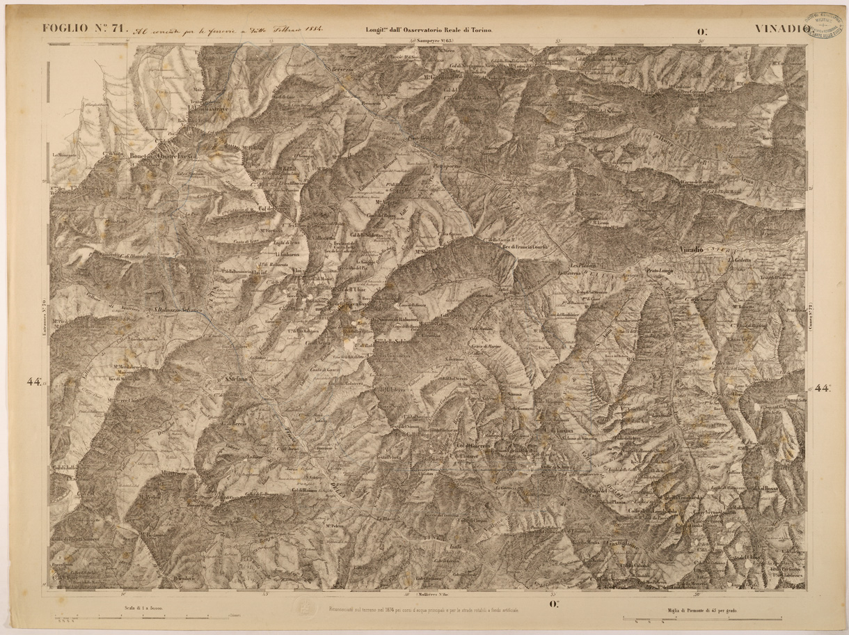 "FOGLIO 71 VINADIO - La proiezione adottata è quella di Flamsteed modificata o di Bonne. Il centro del circolo meridiano stabilito nell' Osservatorio Reale di Torino fu scelto per origine delle coordinate o centro di sviluppamento. Latitudine e longitudine est di questo punto dal meridiano di Parigi,determinate astronomicamente, risultarono: 45°04'08",06 e 5°21'24",75. Elementi che servirono ai calcoli della proiezione furono:semiasse maggiore e minore della terra lunghezza della normale nel punto d'origine raggio del circolo osculatore al meridiano nel punto d'origine schiacciamento terrestre quadrato dell'eccentricità. La superficie fu divisa in quattro regioni corrispontenti al nord-est, sud-est, sud-ovest, nord-ovest comprendendo in complesso 90 fogli. "