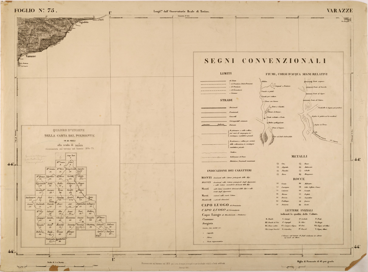 "FOGLIO 75 VARAZZE (QUADRO D'UNIONE DELLA CARTA DEL PIEMONTE E SEGNI CONVENZIONALI) - La proiezione adottata è quella di Flamsteed modificata o di Bonne. Il centro del circolo meridiano stabilito nell' Osservatorio Reale di Torino fu scelto per origine delle coordinate o centro di sviluppamento. Latitudine e longitudine est di questo punto dal meridiano di Parigi,determinate astronomicamente, risultarono: 45°04'08",06 e 5°21'24",75. Elementi che servirono ai calcoli della proiezione furono:semiasse maggiore e minore della terra lunghezza della normale nel punto d'origine raggio del circolo osculatore al meridiano nel punto d'origine schiacciamento terrestre quadrato dell'eccentricità. La superficie fu divisa in quattro regioni corrispontenti al nord-est, sud-est, sud-ovest, nord-ovest comprendendo in complesso 90 fogli. "