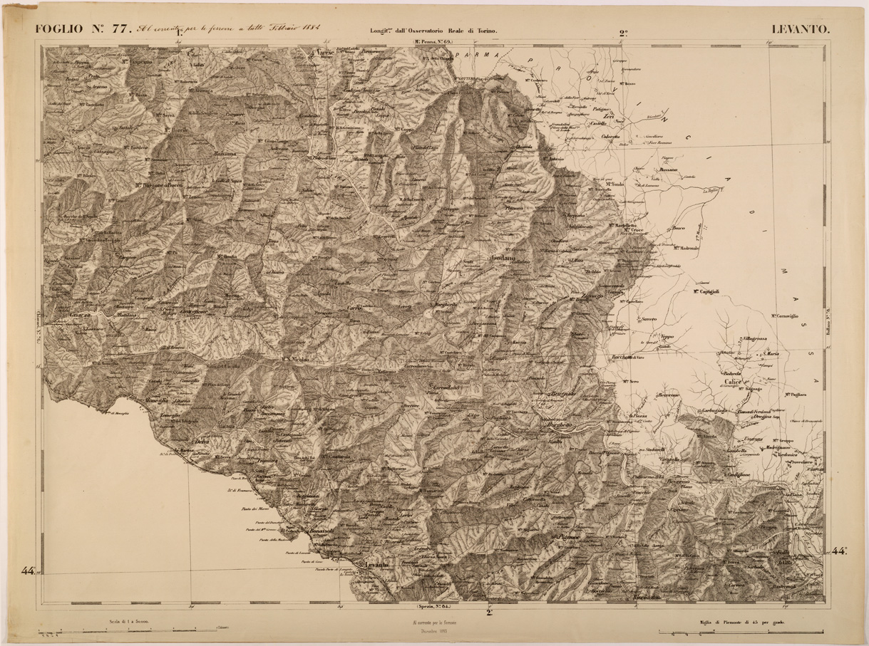 "FOGLIO 77 LEVANTO - La proiezione adottata è quella di Flamsteed modificata o di Bonne. Il centro del circolo meridiano stabilito nell' Osservatorio Reale di Torino fu scelto per origine delle coordinate o centro di sviluppamento. Latitudine e longitudine est di questo punto dal meridiano di Parigi,determinate astronomicamente, risultarono: 45°04'08",06 e 5°21'24",75. Elementi che servirono ai calcoli della proiezione furono:semiasse maggiore e minore della terra lunghezza della normale nel punto d'origine raggio del circolo osculatore al meridiano nel punto d'origine schiacciamento terrestre quadrato dell'eccentricità. La superficie fu divisa in quattro regioni corrispontenti al nord-est, sud-est, sud-ovest, nord-ovest comprendendo in complesso 90 fogli. "