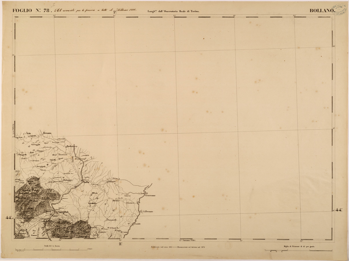 "FOGLIO 78 BOLLANO - La proiezione adottata è quella di Flamsteed modificata o di Bonne. Il centro del circolo meridiano stabilito nell' Osservatorio Reale di Torino fu scelto per origine delle coordinate o centro di sviluppamento. Latitudine e longitudine est di questo punto dal meridiano di Parigi,determinate astronomicamente, risultarono: 45°04'08",06 e 5°21'24",75. Elementi che servirono ai calcoli della proiezione furono:semiasse maggiore e minore della terra lunghezza della normale nel punto d'origine raggio del circolo osculatore al meridiano nel punto d'origine schiacciamento terrestre quadrato dell'eccentricità. La superficie fu divisa in quattro regioni corrispontenti al nord-est, sud-est, sud-ovest, nord-ovest comprendendo in complesso 90 fogli. "