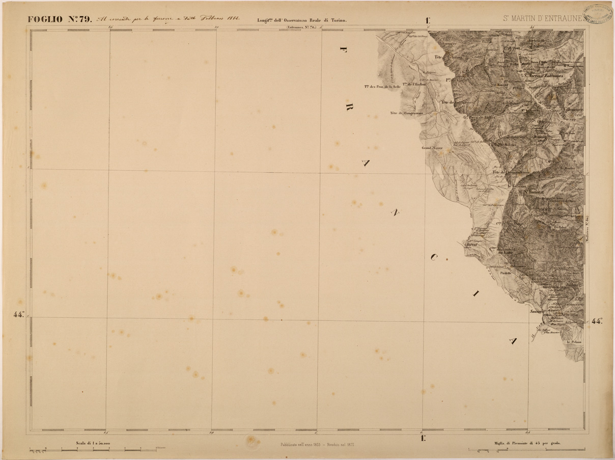 "FOGLIO ST. MARTIN D'ENTRAUNES - La proiezione adottata è quella di Flamsteed modificata o di Bonne. Il centro del circolo meridiano stabilito nell' Osservatorio Reale di Torino fu scelto per origine delle coordinate o centro di sviluppamento. Latitudine e longitudine est di questo punto dal meridiano di Parigi,determinate astronomicamente, risultarono: 45°04'08",06 e 5°21'24",75. Elementi che servirono ai calcoli della proiezione furono:semiasse maggiore e minore della terra lunghezza della normale nel punto d'origine raggio del circolo osculatore al meridiano nel punto d'origine schiacciamento terrestre quadrato dell'eccentricità. La superficie fu divisa in quattro regioni corrispontenti al nord-est, sud-est, sud-ovest, nord-ovest comprendendo in complesso 90 fogli. "