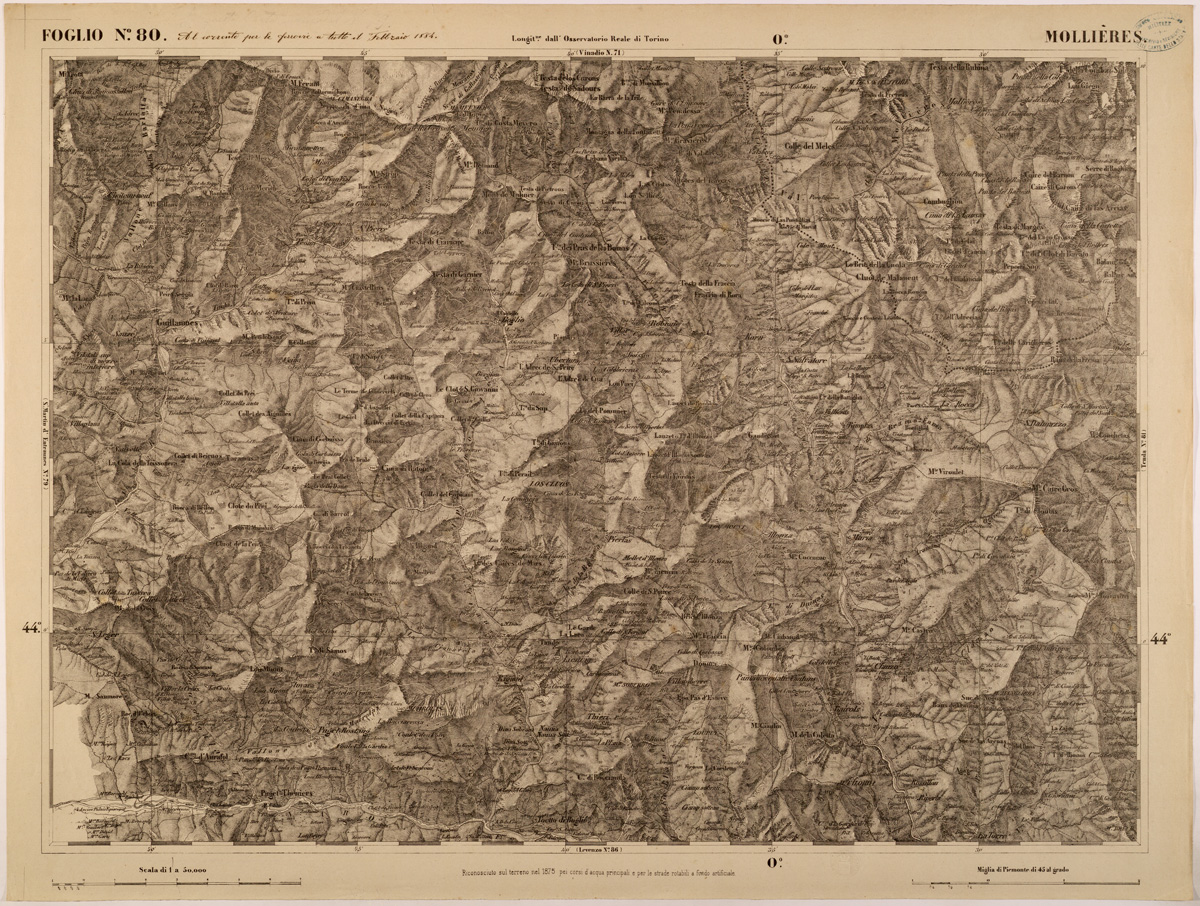 "FOGLIO 80 MOLLIERES - La proiezione adottata è quella di Flamsteed modificata o di Bonne. Il centro del circolo meridiano stabilito nell' Osservatorio Reale di Torino fu scelto per origine delle coordinate o centro di sviluppamento. Latitudine e longitudine est di questo punto dal meridiano di Parigi,determinate astronomicamente, risultarono: 45°04'08",06 e 5°21'24",75. Elementi che servirono ai calcoli della proiezione furono:semiasse maggiore e minore della terra lunghezza della normale nel punto d'origine raggio del circolo osculatore al meridiano nel punto d'origine schiacciamento terrestre quadrato dell'eccentricità. La superficie fu divisa in quattro regioni corrispontenti al nord-est, sud-est, sud-ovest, nord-ovest comprendendo in complesso 90 fogli. "