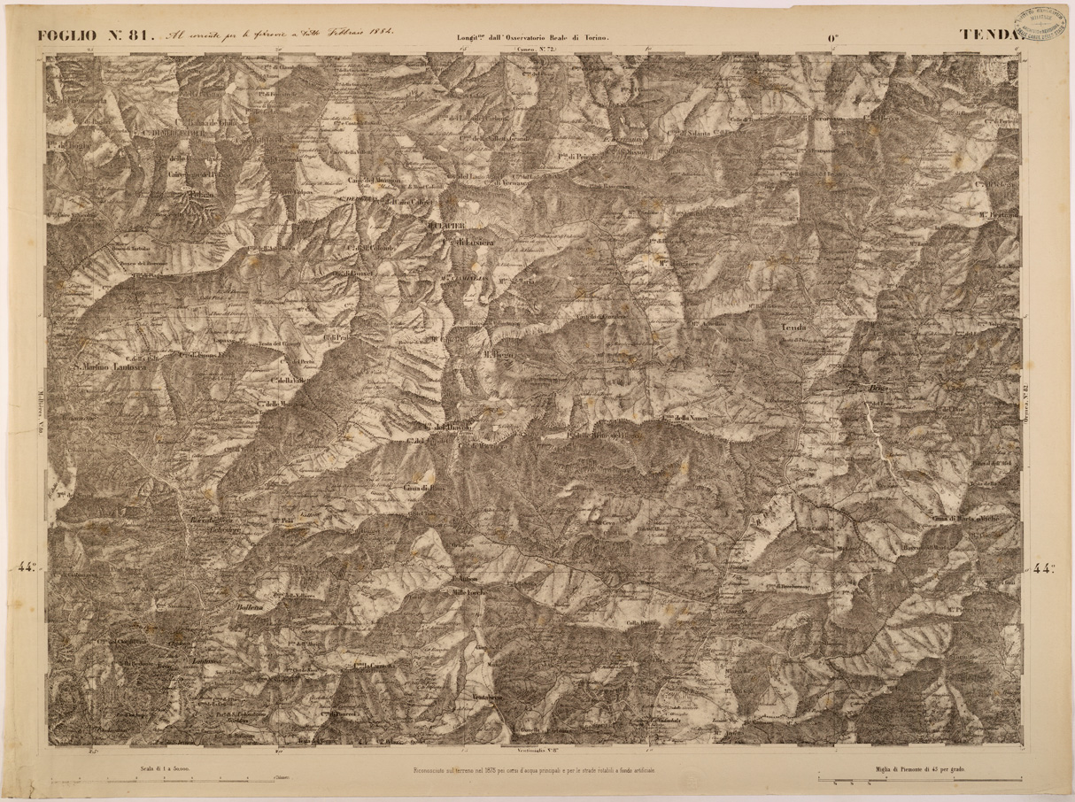 "FOGLIO 81 TENDA - La proiezione adottata è quella di Flamsteed modificata o di Bonne. Il centro del circolo meridiano stabilito nell' Osservatorio Reale di Torino fu scelto per origine delle coordinate o centro di sviluppamento. Latitudine e longitudine est di questo punto dal meridiano di Parigi,determinate astronomicamente, risultarono: 45°04'08",06 e 5°21'24",75. Elementi che servirono ai calcoli della proiezione furono:semiasse maggiore e minore della terra lunghezza della normale nel punto d'origine raggio del circolo osculatore al meridiano nel punto d'origine schiacciamento terrestre quadrato dell'eccentricità. La superficie fu divisa in quattro regioni corrispontenti al nord-est, sud-est, sud-ovest, nord-ovest comprendendo in complesso 90 fogli. "