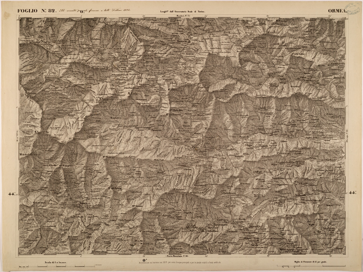 "FOGLIO 82 ORMEA - La proiezione adottata è quella di Flamsteed modificata o di Bonne. Il centro del circolo meridiano stabilito nell' Osservatorio Reale di Torino fu scelto per origine delle coordinate o centro di sviluppamento. Latitudine e longitudine est di questo punto dal meridiano di Parigi,determinate astronomicamente, risultarono: 45°04'08",06 e 5°21'24",75. Elementi che servirono ai calcoli della proiezione furono:semiasse maggiore e minore della terra lunghezza della normale nel punto d'origine raggio del circolo osculatore al meridiano nel punto d'origine schiacciamento terrestre quadrato dell'eccentricità. La superficie fu divisa in quattro regioni corrispontenti al nord-est, sud-est, sud-ovest, nord-ovest comprendendo in complesso 90 fogli. "