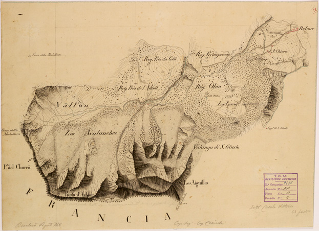 "Rilievi eseguiti da Ufficiali della Scuola Superiore di Guerra, disegnati a colori su carta da disegno montata su tela."