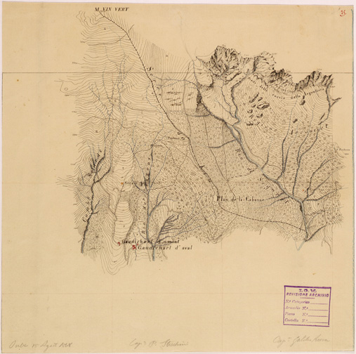"Rilievi eseguiti da Ufficiali della Scuola Superiore di Guerra, disegnati a colori su carta da disegno montata su tela."