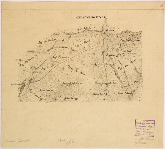 "Rilievi eseguiti da Ufficiali della Scuola Superiore di Guerra, disegnati a colori su carta da disegno montata su tela."