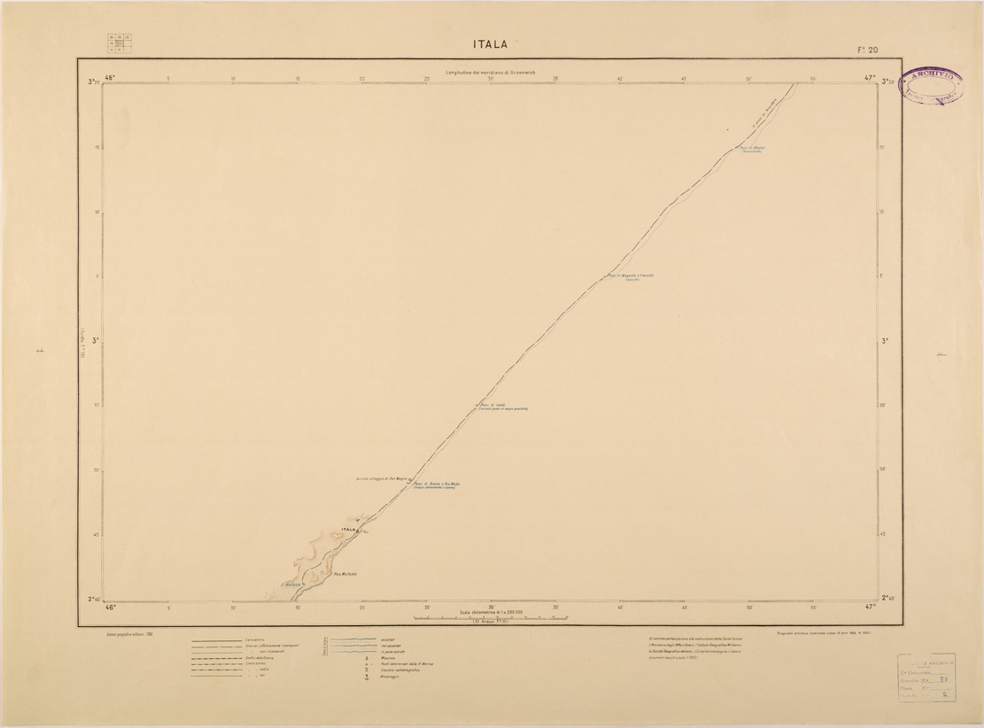 "Carta realizzata dall' IGM in collaborazione con il Ministero degli Esteri e la Società Geografica Italiana, compilata su determinazioni astronomiche, rilievi idrografici della Marina Italiana e itinerari schizzi e rilievi dei vari viaggiatori che percorsero la Regione era stata inizialmente progettata in 40 fogli ma ne furono realizzati solo i 12 rappresentanti la fascia costiera dalla foce del Giuba a Itala."