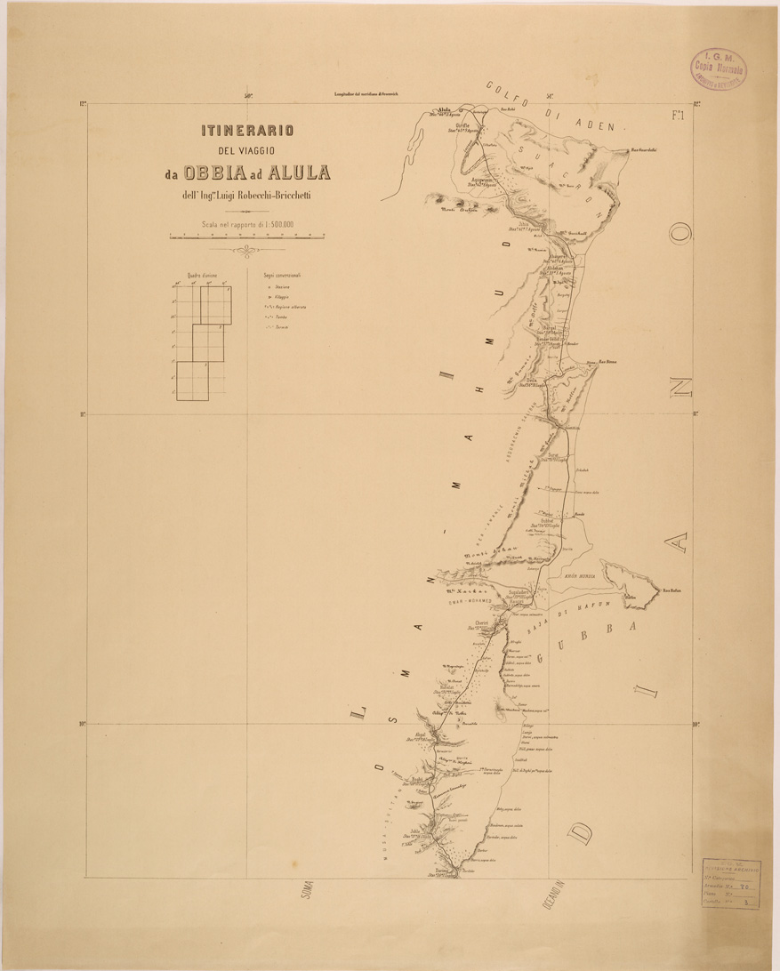 "Originali rappresentanti l' itinerario percorso dall' ingegnere Robecchi Bricchetti nella Somalia Italiana dal 28 Maggio al 11 Agosto del 1890 con l' appoggio del Governo, della Società Geografica Italiana e della Società Africana d' Italia, i dati raccolti nel viaggio, di circa 1000 Kilometri, contribuirono grandemente alla ulteriore conoscenza di quella Colonia, la carta fu compilata e disegnata dal Topografo Marchegiani e pubblicata a colori e alla scala di 1:1.000.000 dalla Società Geografica Italiana."