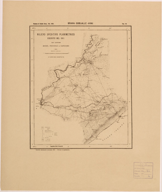 "Riduzione dell' omonima carta alla scala di 1:100.000 ( stesso categorico file SE002050 ) la presente carta è stata inserita nella relazione del Tenente Nobile Giacomo De Martino " La Somalia Italiana nei tre anni del mio Governo" edita nel 1912 e in " Cosmos " di Guido Cora Volume XIII"