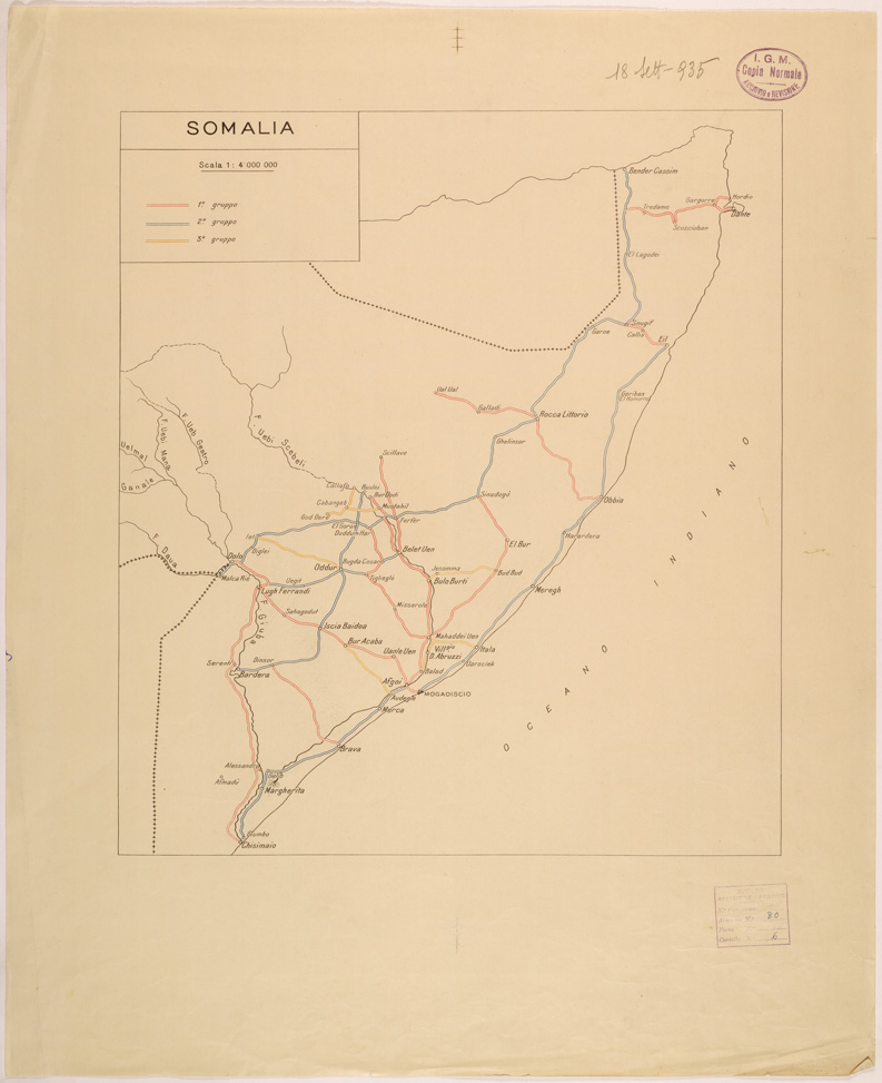 "Carta realizzata dalla Divisione Cartografica dell' IGM per un progetto di sistemazione stradale della Somalia all' inizio delle operazioni militari in Africa Orientale, vi sono rappresentati la linea costiera, i confini, corsi d' acqua, strade e la relativa toponomastica."