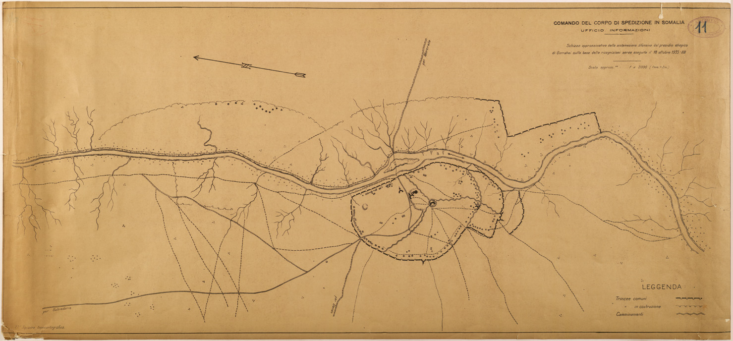 "Copia eliografica dello schizzo approssimativo della sistemazione difensiva del Presidio Etiopico, realizzato dalla 27° Squadra Topocartografica del Comando del Corpo di Spedizione in Somalia sulla base delle ricognizioni aeree del 18 Ottobre 1935"