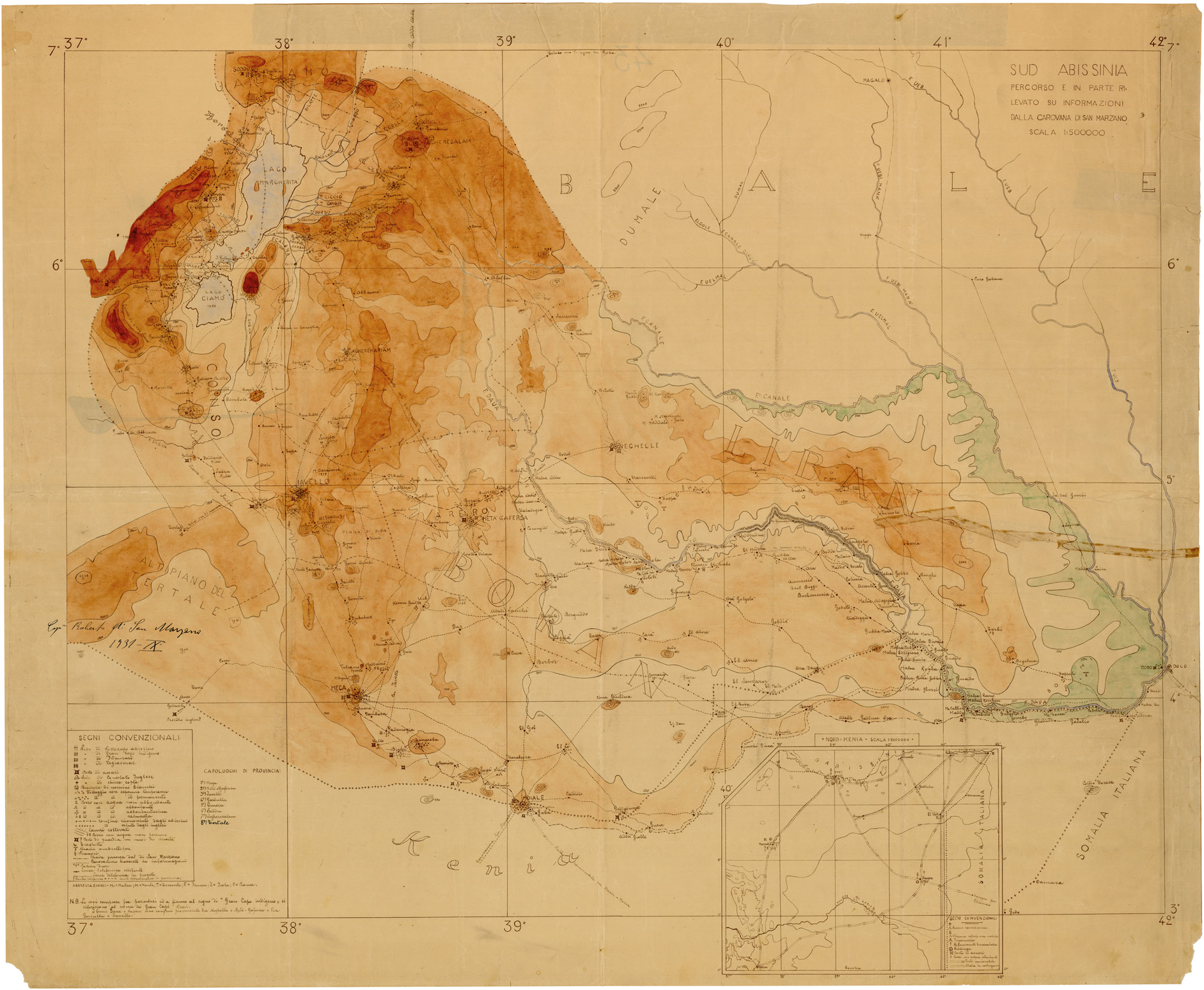 "Copia eliografica della zona percorsa e in parte rilevata su informazioni della Carovana di San Marzano, all' interno un riquadro alla scala di 1:2.000.000 del nord del Kenia."
