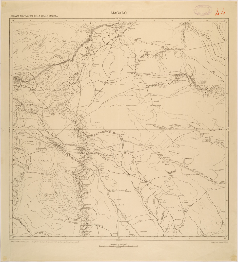 "Carta in 6 fogli compilata dalla 27° Squadra Topocartografica del Comando Forze Armate della Somalia sulla base di elementi noti completati da rilievi speditivi e informazioni."