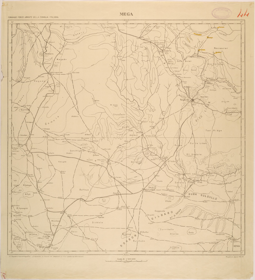 "Carta in 6 fogli compilata dalla 27° Squadra Topocartografica del Comando Forze Armate della Somalia sulla base di elementi noti completati da rilievi speditivi e informazioni."
