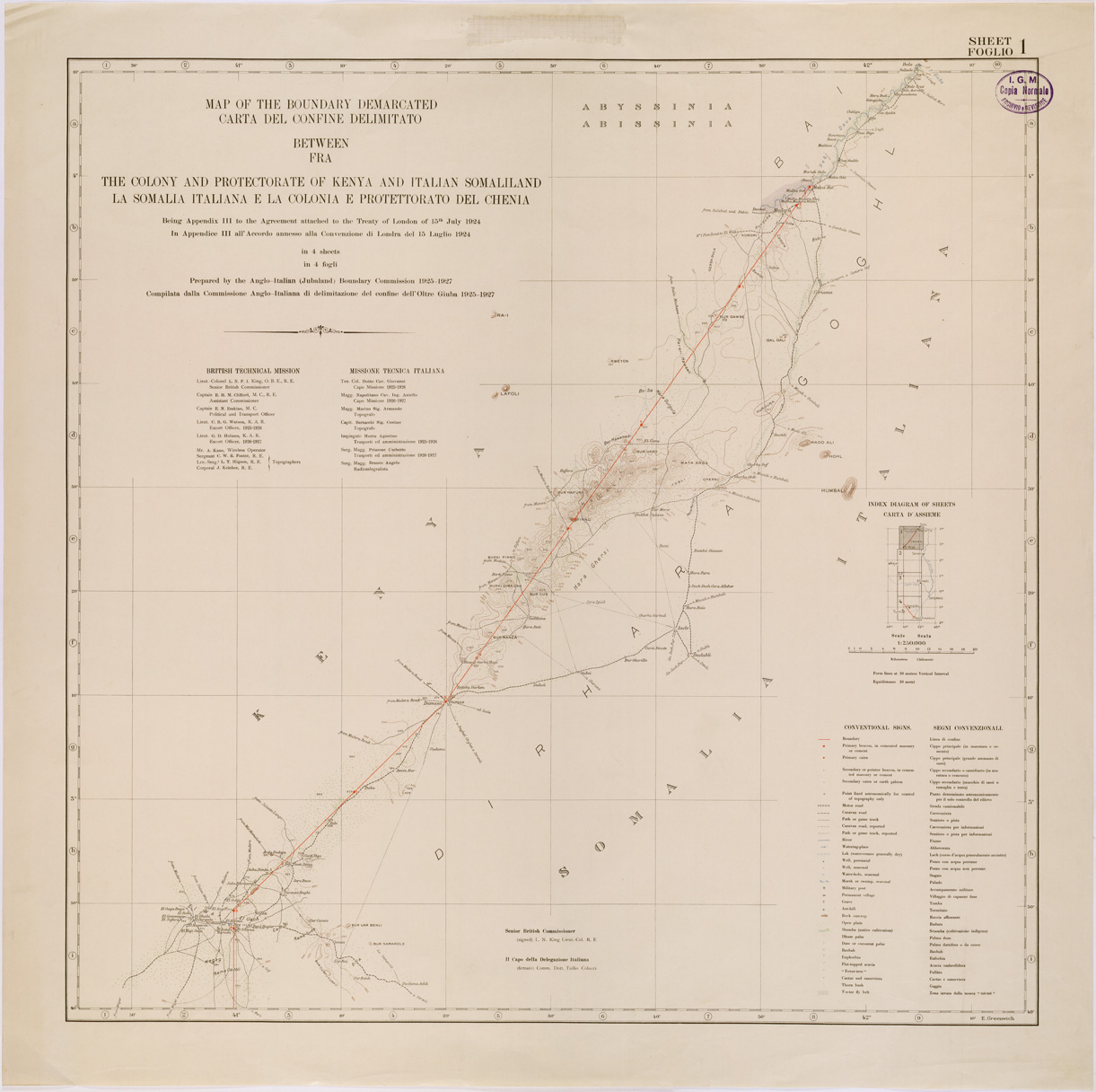 "Carta bilingue ( Italiano - Inglese ) in 4 fogli compilata dalla Commissione Anglo - Italiana di delimitazione dei confini, nell' estate 1927 le due delegazioni riunite conclusero i lavori presso l' IGM con la compilazione della relazione descrittiva del confine e della carta. Notizie più dettagliate nella pubblicazione " L' Italia in Africa " del Generale C. Traversi"