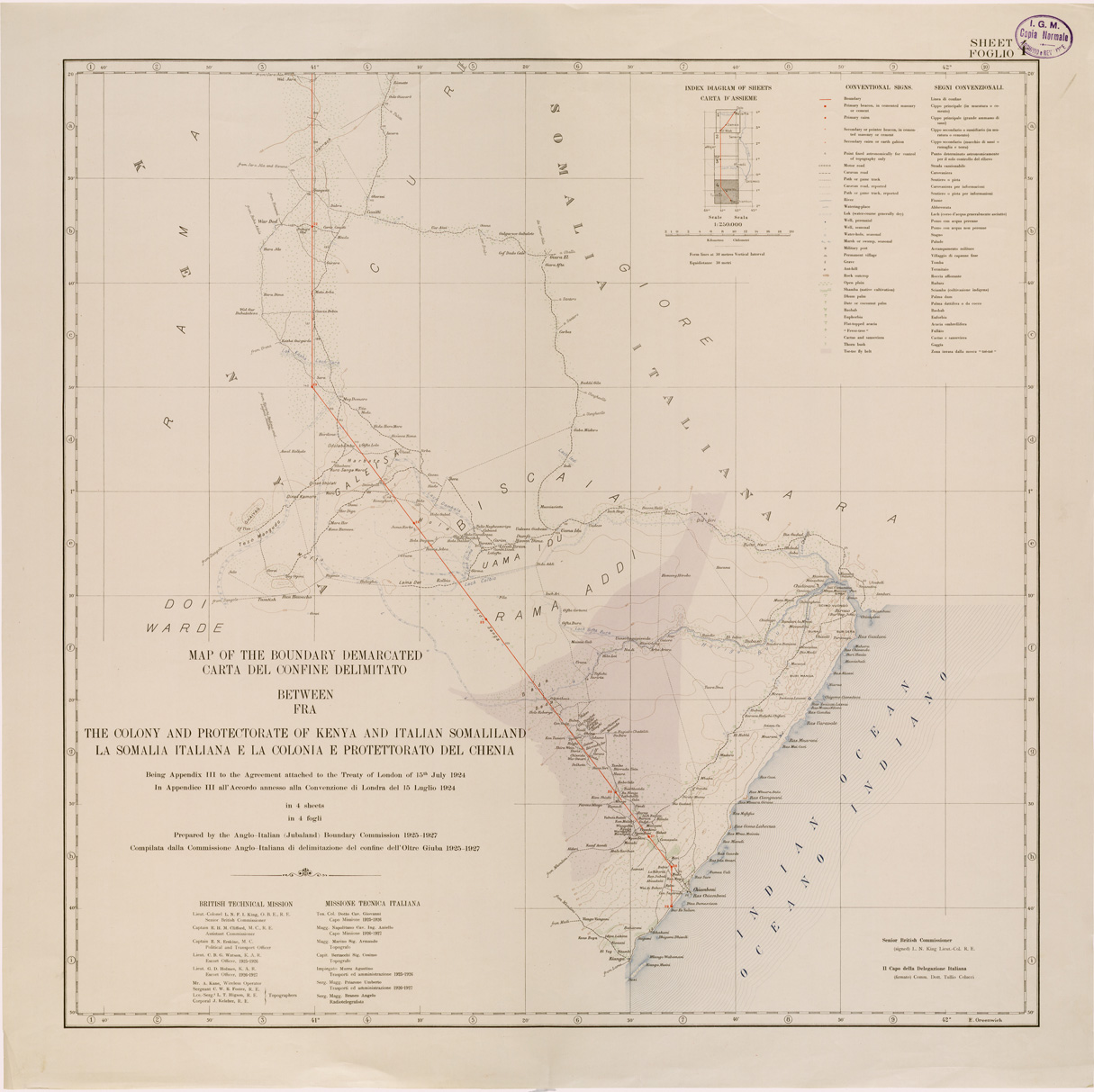"Carta bilingue ( Italiano - Inglese ) in 4 fogli compilata dalla Commissione Anglo - Italiana di delimitazione dei confini, nell' estate 1927 le due delegazioni riunite conclusero i lavori presso l' IGM con la compilazione della relazione descrittiva del confine e della carta. Notizie più dettagliate nella pubblicazione " L' Italia in Africa " del Generale C. Traversi"