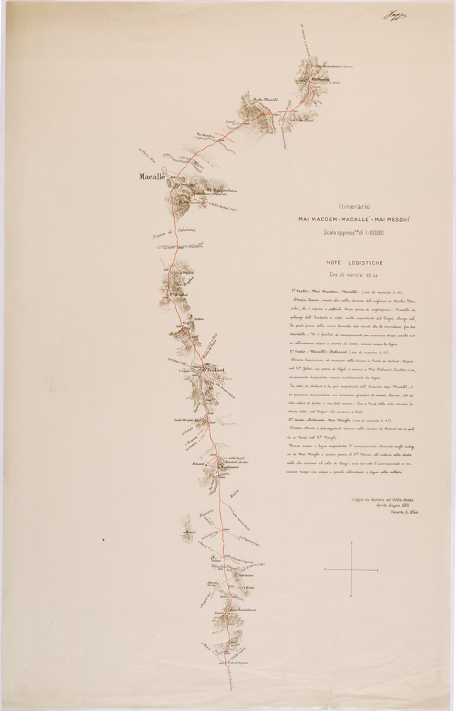 "Carta rappresentante l' itinerario seguito dal Tenente Elia durante il suo viaggio da Asmara a Addis Abeba da Aprile a Giugno 1906 le prime 6 sezioni ( derivanti dalle prime 7 originali ) sono stampate a colori, le sezioni dalla 8 alla 24 in nero, ogni sezione riporta le relative note logistiche e le ore di marcia. Questi itinerari insieme con altri rilievi speditivi, schizzi e itinerari inediti furono usati per la compilazione dei fogli 9 e 10 della carta dimostrativa della Coloni Eritrea e regioni adiacenti alla scala di 1:400.000"