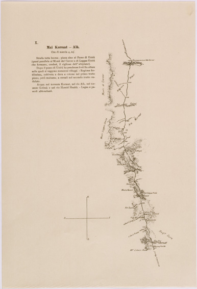 "Carta rappresentante l' itinerario seguito dal Tenente Elia durante il suo viaggio da Asmara a Addis Abeba da Aprile a Giugno 1906 le prime 6 sezioni ( derivanti dalle prime 7 originali ) sono stampate a colori, le sezioni dalla 8 alla 24 in nero, ogni sezione riporta le relative note logistiche e le ore di marcia. Questi itinerari insieme con altri rilievi speditivi, schizzi e itinerari inediti furono usati per la compilazione dei fogli 9 e 10 della carta dimostrativa della Coloni Eritrea e regioni adiacenti alla scala di 1:400.000"