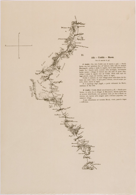 "Carta rappresentante l' itinerario seguito dal Tenente Elia durante il suo viaggio da Asmara a Addis Abeba da Aprile a Giugno 1906 le prime 6 sezioni ( derivanti dalle prime 7 originali ) sono stampate a colori, le sezioni dalla 8 alla 24 in nero, ogni sezione riporta le relative note logistiche e le ore di marcia. Questi itinerari insieme con altri rilievi speditivi, schizzi e itinerari inediti furono usati per la compilazione dei fogli 9 e 10 della carta dimostrativa della Coloni Eritrea e regioni adiacenti alla scala di 1:400.000"