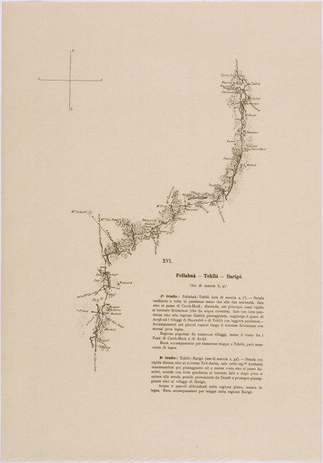 "Carta rappresentante l' itinerario seguito dal Tenente Elia durante il suo viaggio da Asmara a Addis Abeba da Aprile a Giugno 1906 le prime 6 sezioni ( derivanti dalle prime 7 originali ) sono stampate a colori, le sezioni dalla 8 alla 24 in nero, ogni sezione riporta le relative note logistiche e le ore di marcia. Questi itinerari insieme con altri rilievi speditivi, schizzi e itinerari inediti furono usati per la compilazione dei fogli 9 e 10 della carta dimostrativa della Coloni Eritrea e regioni adiacenti alla scala di 1:400.000"