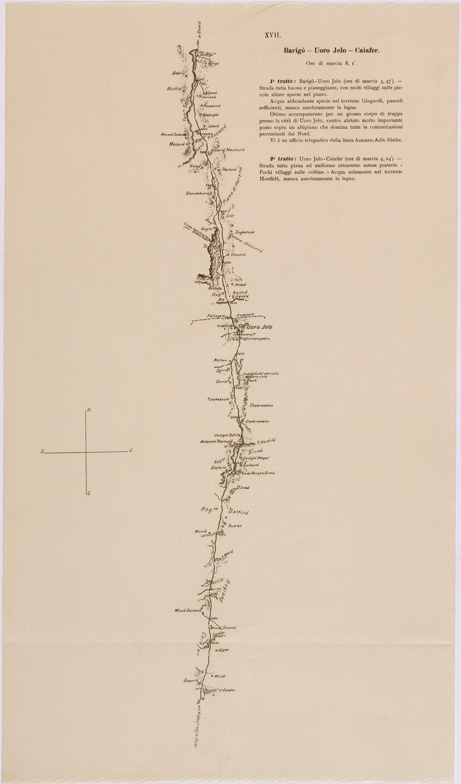 "Carta rappresentante l' itinerario seguito dal Tenente Elia durante il suo viaggio da Asmara a Addis Abeba da Aprile a Giugno 1906 le prime 6 sezioni ( derivanti dalle prime 7 originali ) sono stampate a colori, le sezioni dalla 8 alla 24 in nero, ogni sezione riporta le relative note logistiche e le ore di marcia. Questi itinerari insieme con altri rilievi speditivi, schizzi e itinerari inediti furono usati per la compilazione dei fogli 9 e 10 della carta dimostrativa della Coloni Eritrea e regioni adiacenti alla scala di 1:400.000"