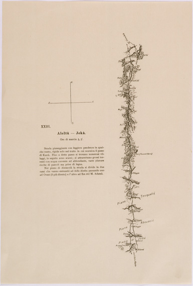 "Carta rappresentante l' itinerario seguito dal Tenente Elia durante il suo viaggio da Asmara a Addis Abeba da Aprile a Giugno 1906 le prime 6 sezioni ( derivanti dalle prime 7 originali ) sono stampate a colori, le sezioni dalla 8 alla 24 in nero, ogni sezione riporta le relative note logistiche e le ore di marcia. Questi itinerari insieme con altri rilievi speditivi, schizzi e itinerari inediti furono usati per la compilazione dei fogli 9 e 10 della carta dimostrativa della Coloni Eritrea e regioni adiacenti alla scala di 1:400.000"