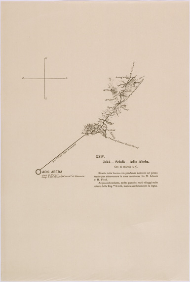 "Carta rappresentante l' itinerario seguito dal Tenente Elia durante il suo viaggio da Asmara a Addis Abeba da Aprile a Giugno 1906 le prime 6 sezioni ( derivanti dalle prime 7 originali ) sono stampate a colori, le sezioni dalla 8 alla 24 in nero, ogni sezione riporta le relative note logistiche e le ore di marcia. Questi itinerari insieme con altri rilievi speditivi, schizzi e itinerari inediti furono usati per la compilazione dei fogli 9 e 10 della carta dimostrativa della Coloni Eritrea e regioni adiacenti alla scala di 1:400.000"