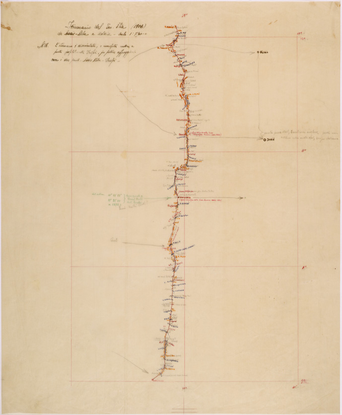 "Originale su carta lucida disegnato a penna con inchiostri colorati rappresentante lo stesso percorso dell' itinerario in 23 sezioni alla scala di 1:100.000"