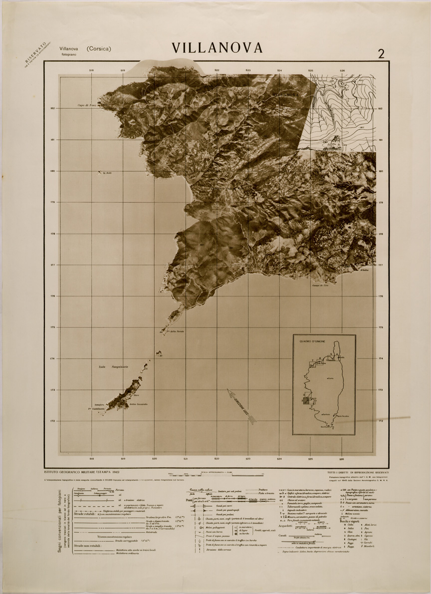 "Fotopiani topografici allestiti dall' IGM con fotogrammi eseguiti nel 1943 dalla Sezione Aerofotografica S.M.R.A. l' interpretezione topografica fù eseguita consultando la relativa carta Francese alla scala di 1:50.000 e interpretando i fotogrammi senza ricognizione sul terreno."