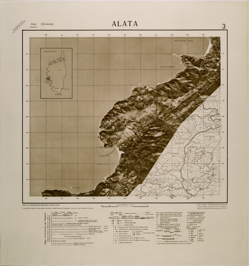 "Fotopiani topografici allestiti dall' IGM con fotogrammi eseguiti nel 1943 dalla Sezione Aerofotografica S.M.R.A. l' interpretezione topografica fù eseguita consultando la relativa carta Francese alla scala di 1:50.000 e interpretando i fotogrammi senza ricognizione sul terreno."