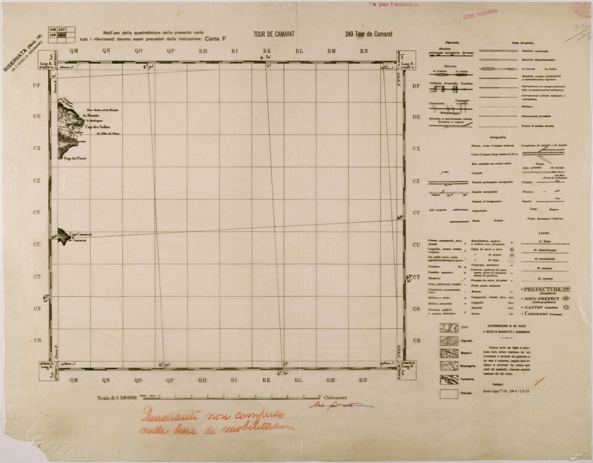"Carta realizzata dall' IGM mediante ingrandimento della carta alla scala di 1:80.000 dell' Istituto Geografico Francese, edizione 1936 stampa 1937"